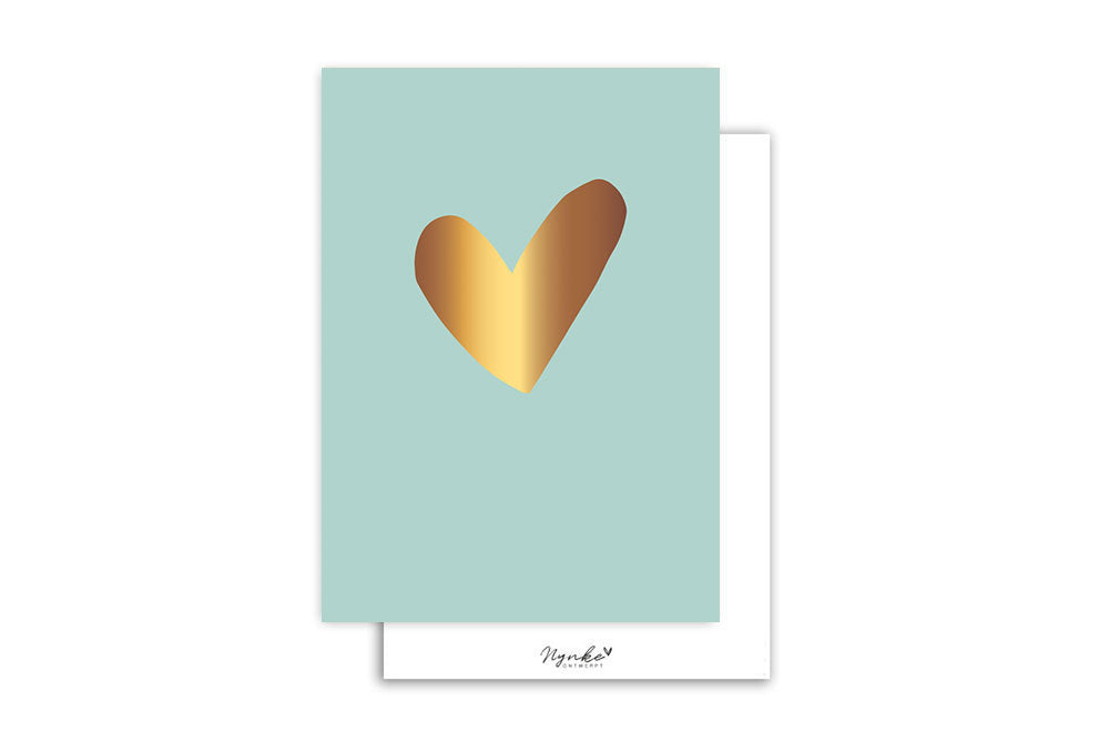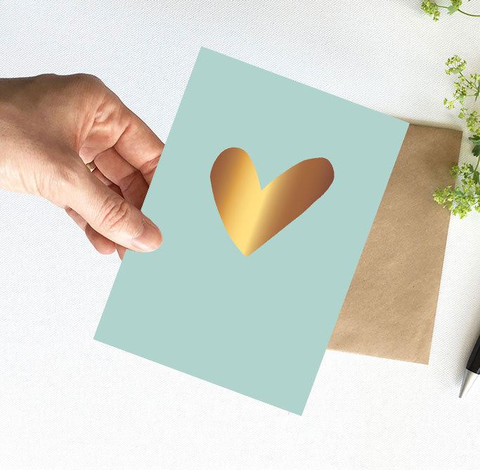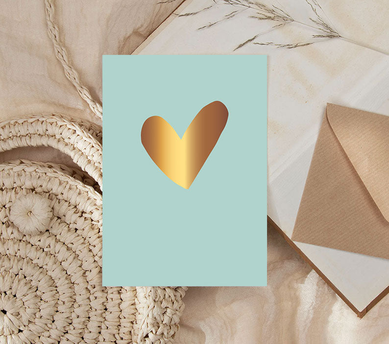 Laat de zon schijnen met deze stijlvolle kaart in frisse Beach Blue, versierd met een sprankelend gouden hart. De combinatie van de zachte kleur en het glanzende goudfolie zorgt voor een zomers, warm gevoel – perfect om iemand te verrassen, te bedanken of zomaar wat liefde te sturen.