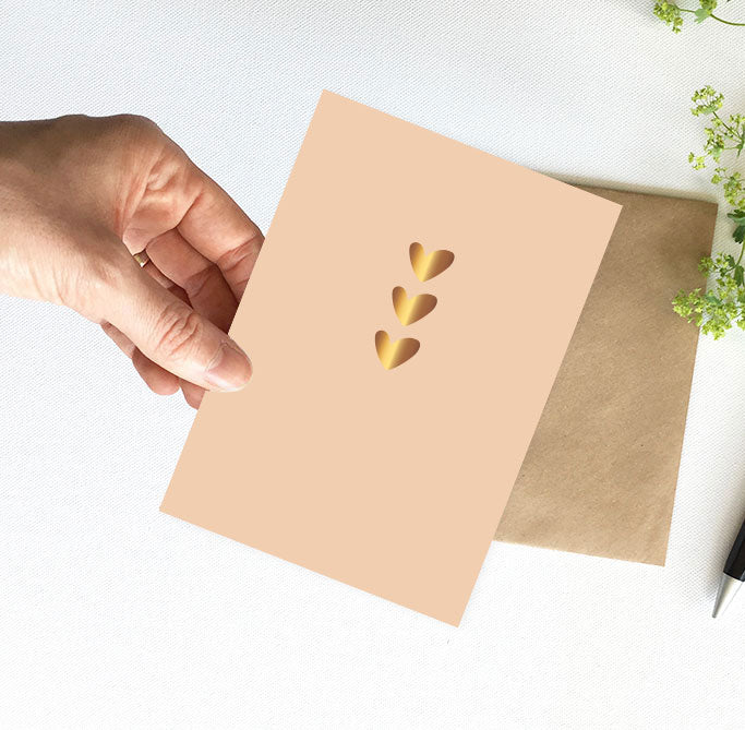Soms zeggen drie kleine hartjes meer dan duizend woorden. Deze kaart straalt eenvoud, warmte en liefde uit. Perfect om iemand te laten weten hoe bijzonder die voor je is. Of het nu Valentijnsdag is, jullie jubileum of gewoon een gewone dag die wat extra liefde verdient, deze kaart past altijd. Een subtiele, stijlvolle manier om je gevoel te delen, precies zoals jij dat wilt.