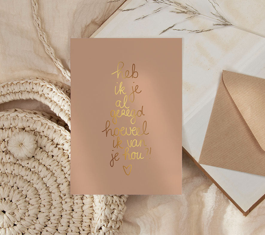 Een stijlvolle A6 kaart! Gemaakt van stevig 300 grams papier, biedt voldoende ruimte om een persoonlijke boodschap te schrijven. De handgeschreven tekst in glanzend goudfolie voegt een luxe uitstraling toe, waardoor deze kaart extra speciaal wordt.