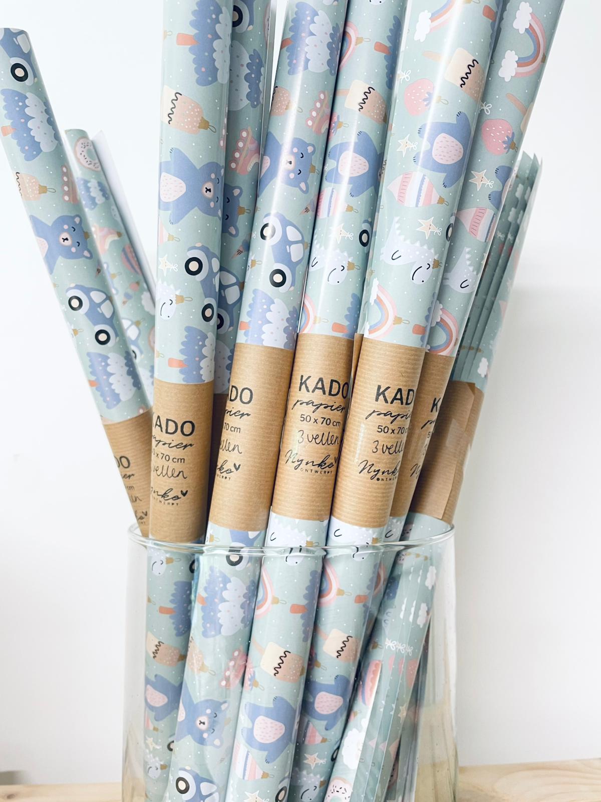 Het kadopapier is gemaakt van 100 grams licht glanzend papier. Je ontvangt 3 vellen van 50x70cm en wordt opgerold geleverd.