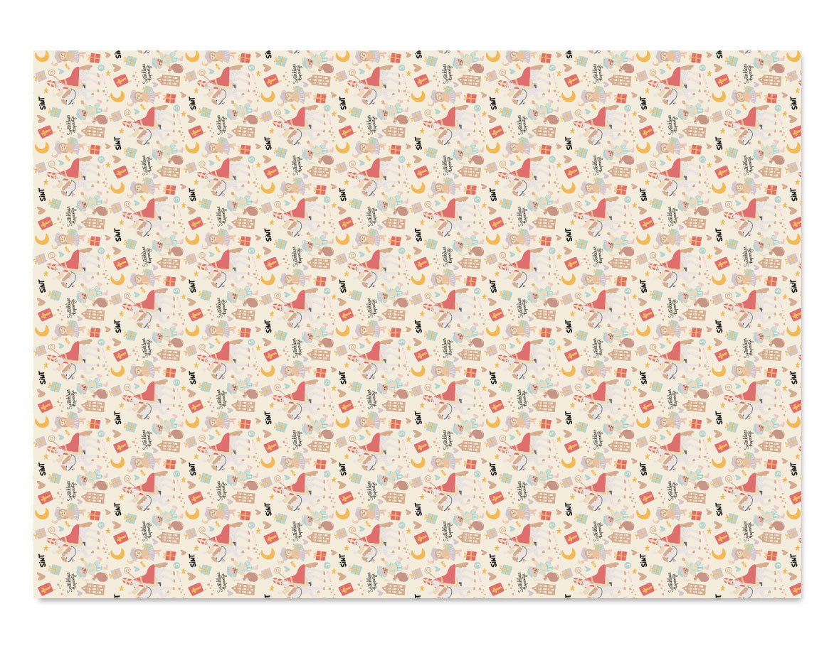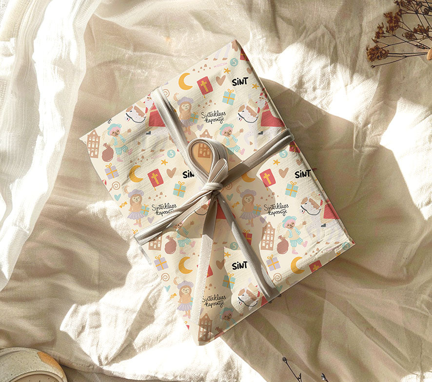 Maak van elk cadeautje een klein feestje met dit vrolijke Sinterklaaspapier vol klassieke illustraties. Van de goedheiligman op zijn schimmel tot Pietjes, cadeautjes, mijters en pepernoten dit papier zit boordevol herkenbare elementen die kinderen (en volwassenen!) direct in de pakjesavond stemming brengen.